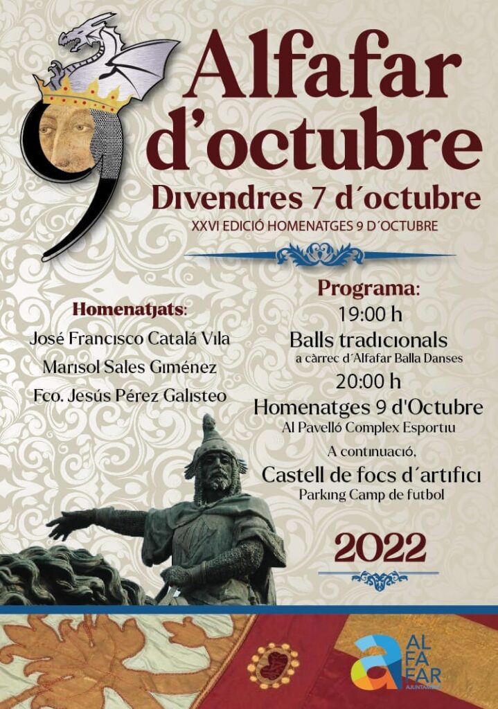 Este año el Ayuntamiento de Alfafar me va a conceder el reconocimiento 9 d’Octubre y no quepo en mí de la emoción. El acto se celebrará el viernes 7 de octubre en el Pavelló Complex Esportiu de Alfafar (enfrente de la Guardia Civil) a las 20h, aunque se recomienda a todos los asistentes que estén desde las 19h30. La entrada es libre y sin restricciones de aforo.