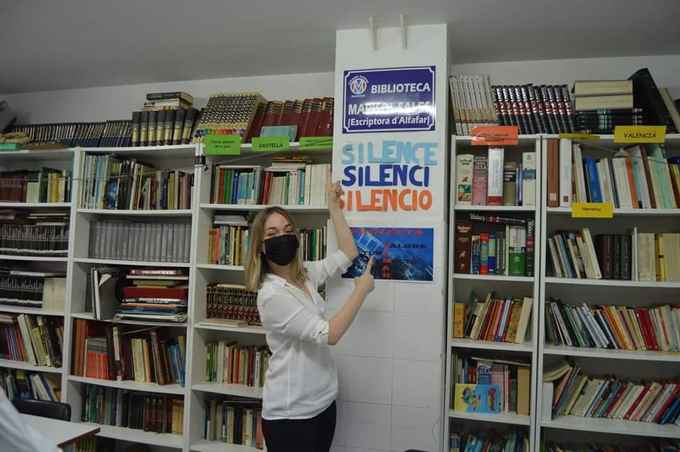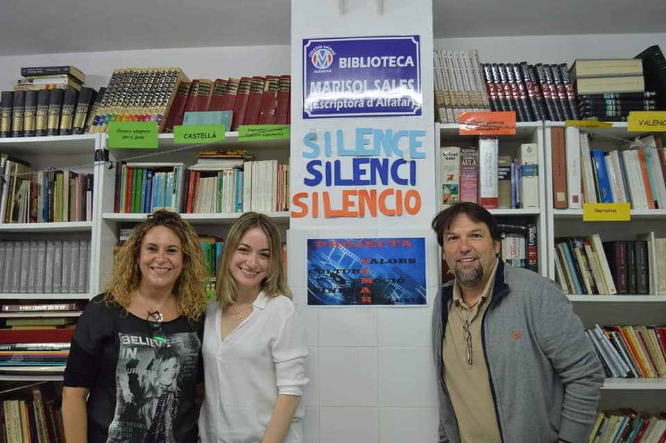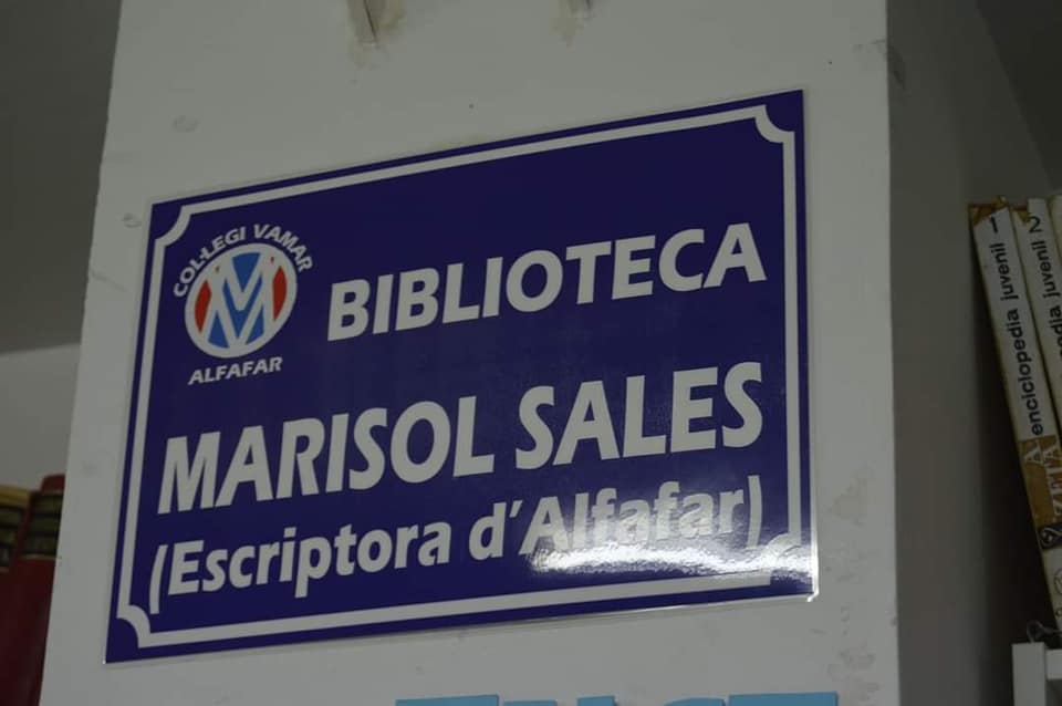 Durante el coloquio celebrado en Alfafar por el Día de las Escritoras me enteré de que la biblioteca del Colegio Vamar llevaba mi nombre. Tras el acto nos acercamos al colegio para verlo y por muchas veces que lo mire y lo remire aún no me lo creo.